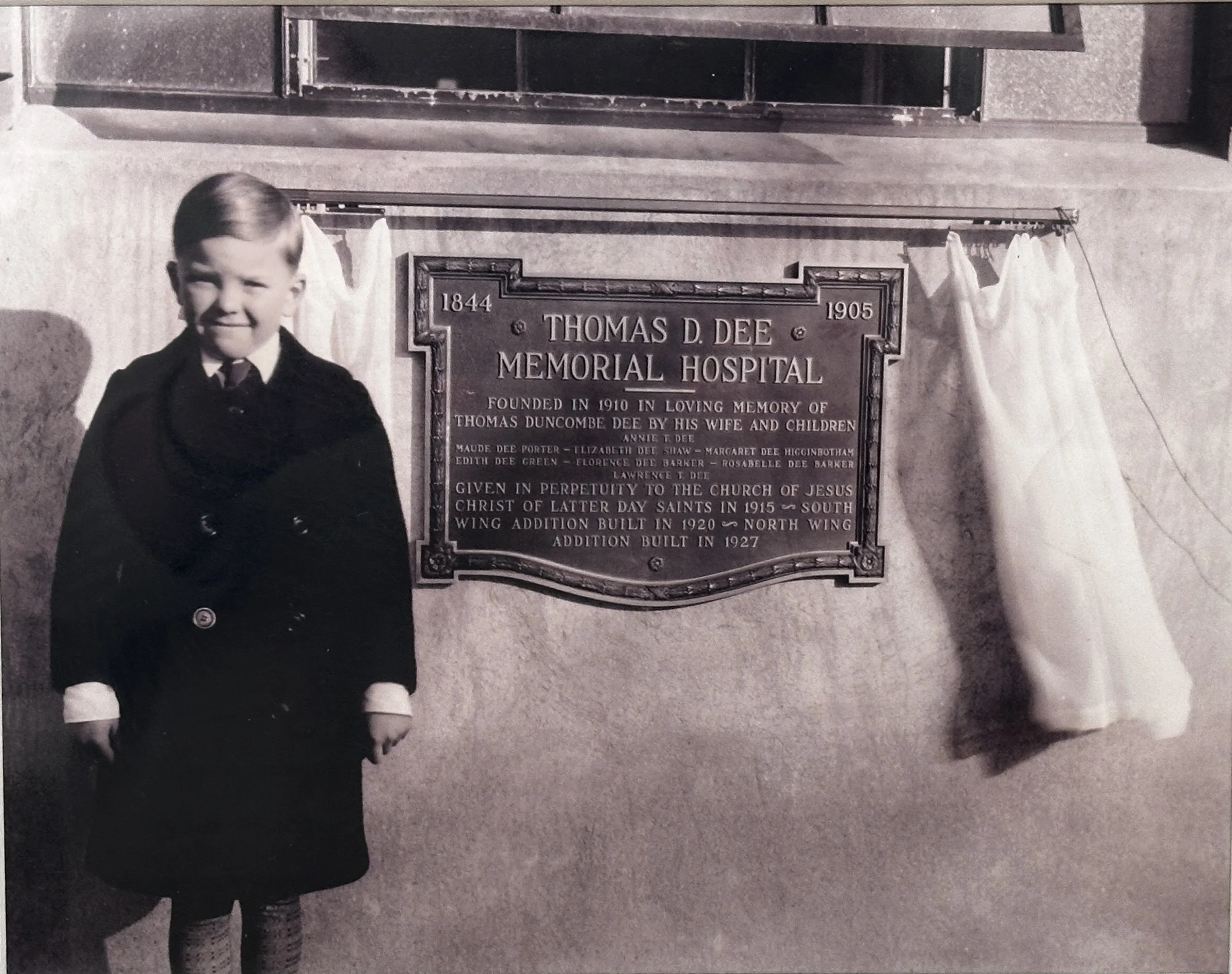 Young Tommy Dee (Thomas D. Dee II) poses in front of the original Thomas D. Dee Memorial Hospital.